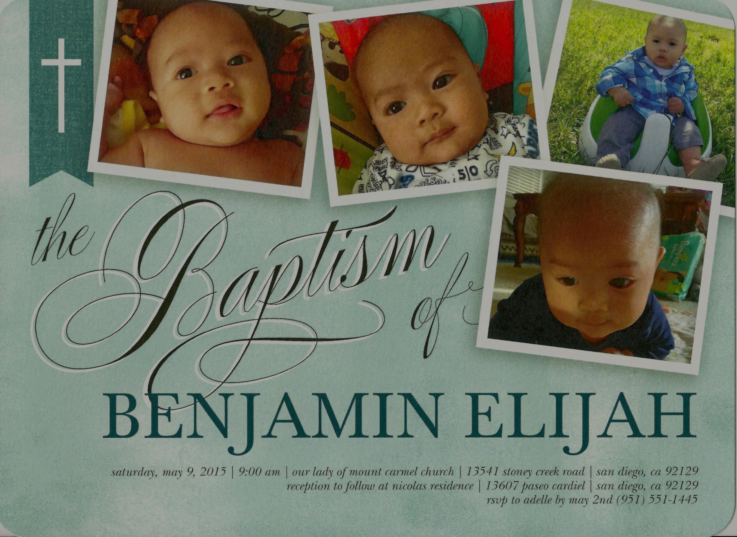 On Saturday, May 9, 2015 at 1:30PM, you are all welcome to witness Benjamin Elijah Arias Nicolas be baptized at Our Lady of Mount Carmel Catholic Church followed by a reception at our residence which is less than a mile west! So please come and celebrate with us!
